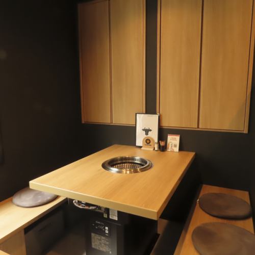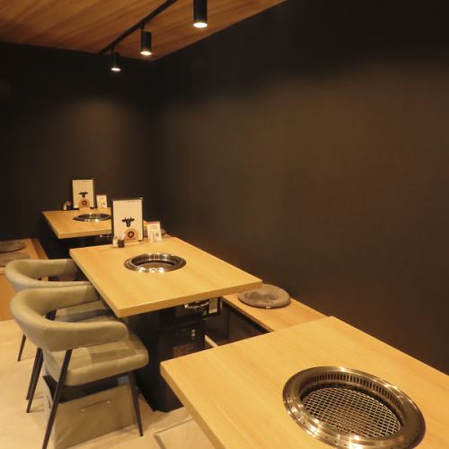 【プライベート感のある席構成】テーブルごとに仕切りがあり、周囲を気にせず食事を楽しめる造り。少人数での食事会やカップル利用に最適な落ち着いた空間です。やわらかな照明が照らす中、香ばしい焼肉の香りに包まれながら、くつろぎの時間を過ごせます。